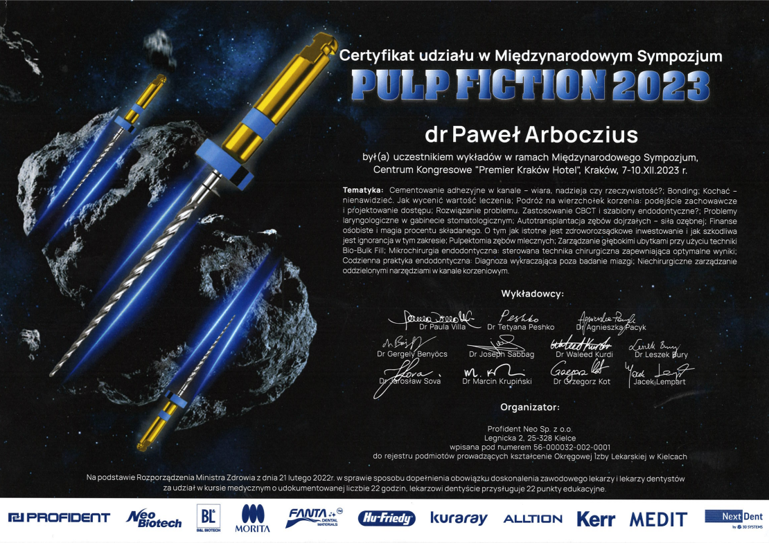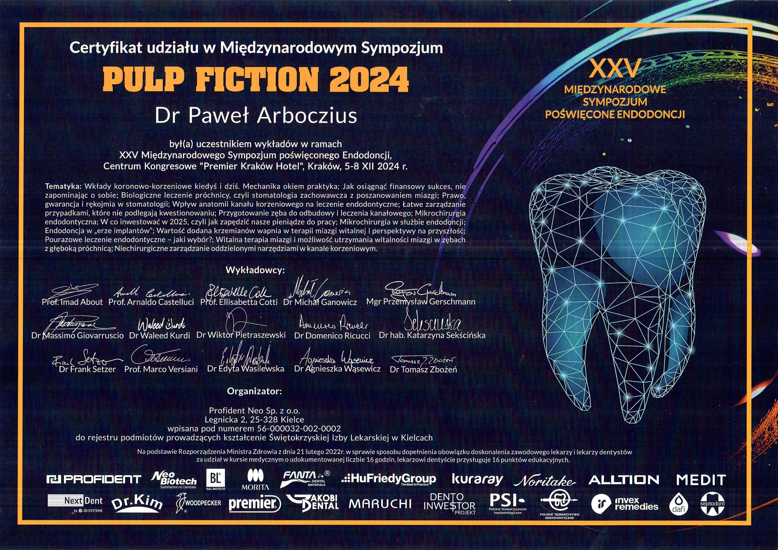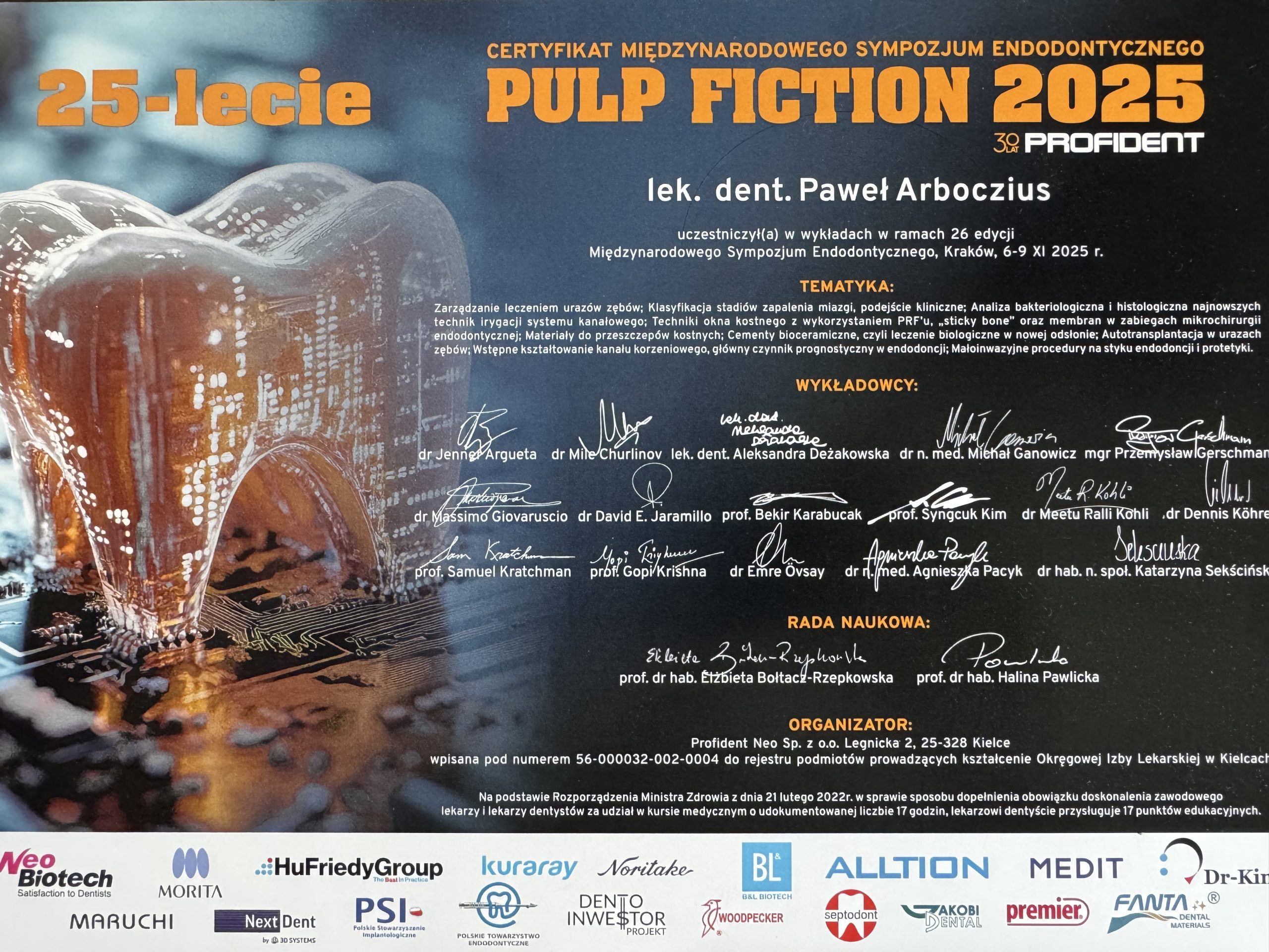 Jestem członkiem stowarzyszeń PTE (Polskie Towarzystwo Endodontyczne), ESE (European Society of Endodontology) oraz Mensa Polska.